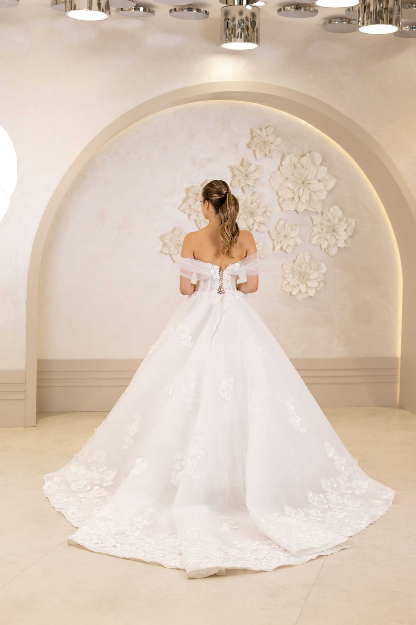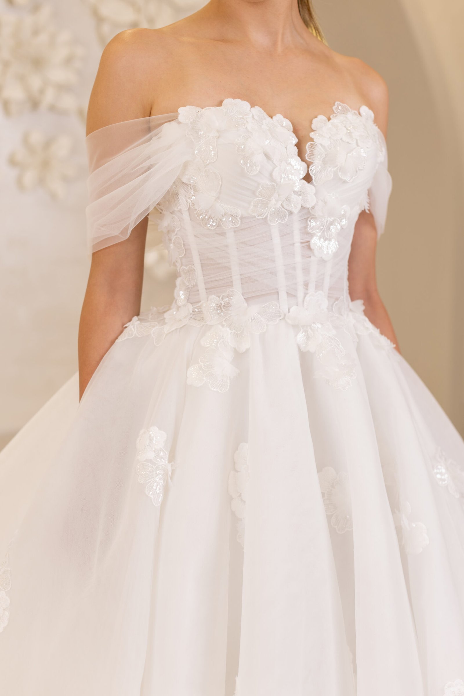 Prenses model kesimi ile hacimli ve etkileyici bir duruş sunan Efsun, kayık yaka ve drapeli transparan bedeni ile modern bir dokunuş kazanıyor. 3 boyutlu çiçek detayları, gelinliğe romantik bir hareket ve sofistike bir ışıltı katıyor. Özel gününüzde hem masalsı hem göz alıcı bir tercihtir.