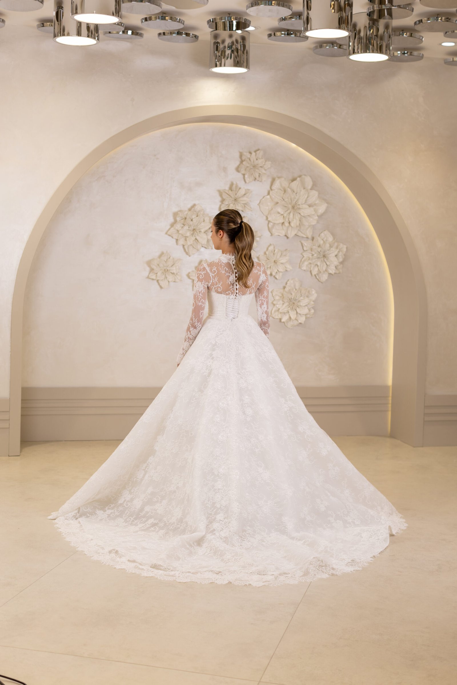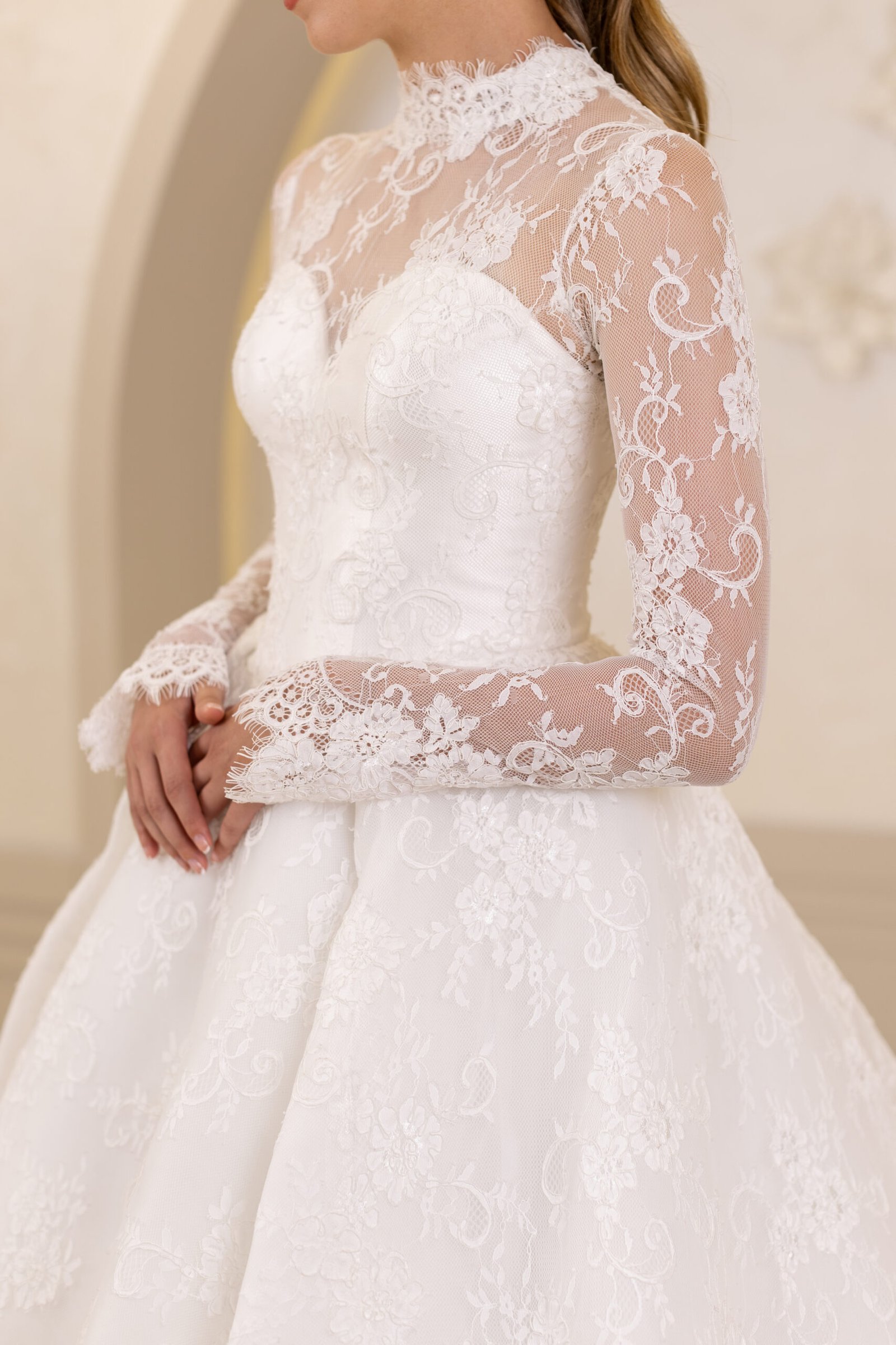 Prenses model siluetiyle hacimli ve asil bir duruş sunan Kinsey, fransız danteli ve uzun kollarıyla sofistike bir etki yaratıyor. Hakim yaka kesimi, gelinliğe zarif bir çizgi kazandırarak özel gününüzde şıklığı ve asilliği bir arada sunuyor..