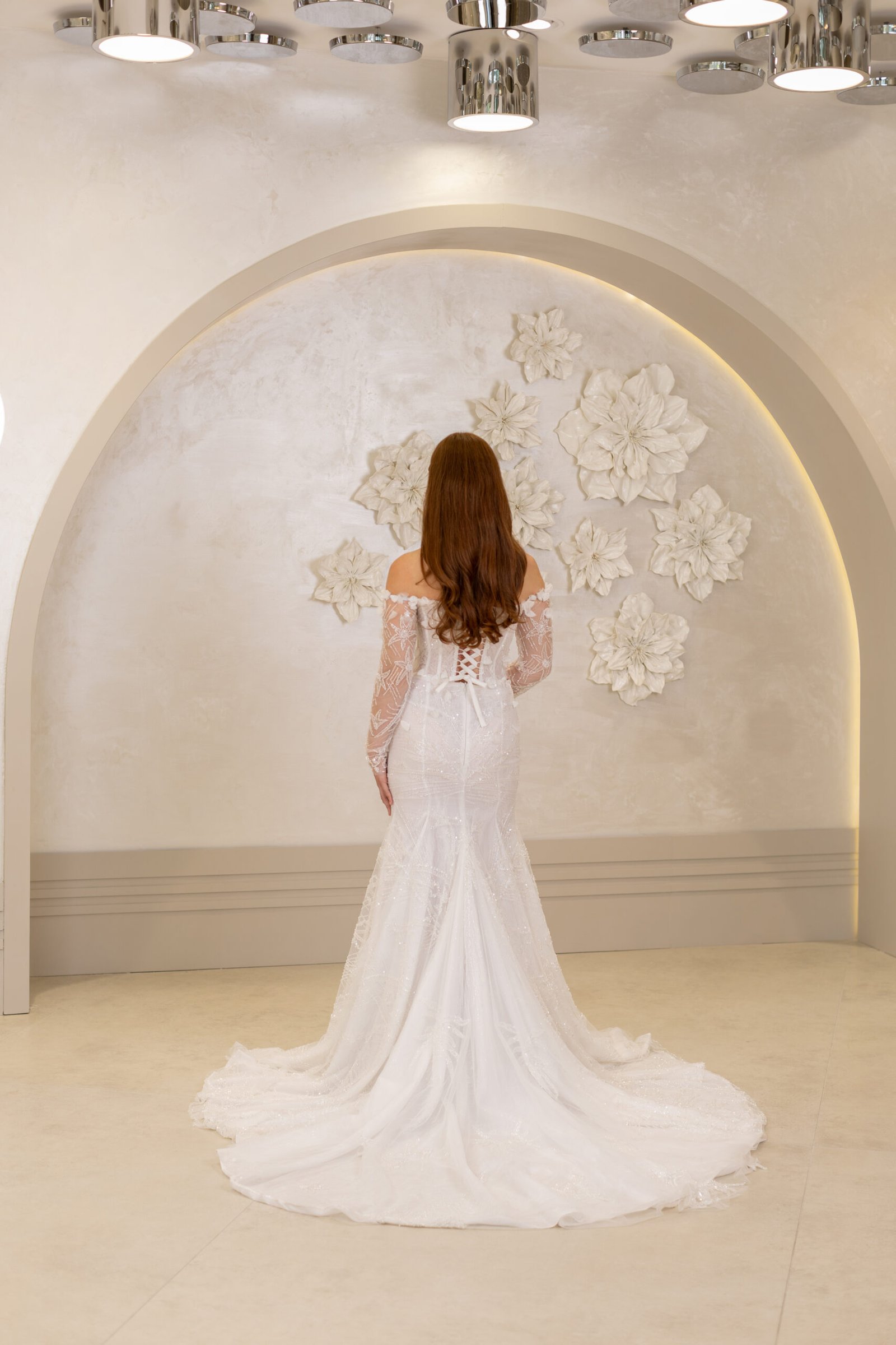 Balık model siluetiyle vücudu zarifçe saran Stella, kayık yaka kesimiyle feminen bir duruş sunuyor. 3 boyutlu yaprak detayları ve boncuk işlemeli uzun kolları, gelinliğe romantik bir dokunuş ve sofistike bir ışıltı katıyor. Özel gününüzde zarafeti ön plana çıkaran bir seçim.