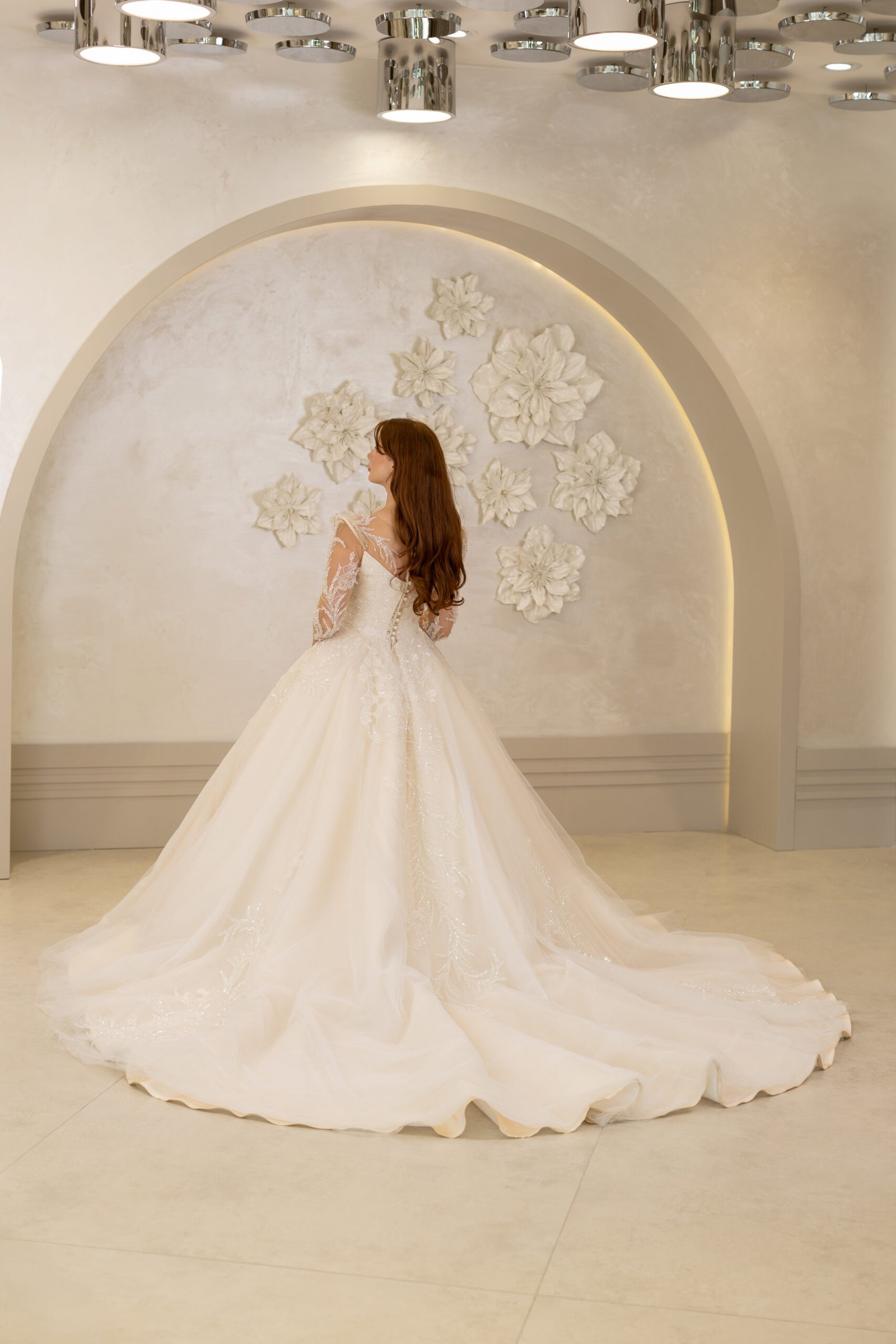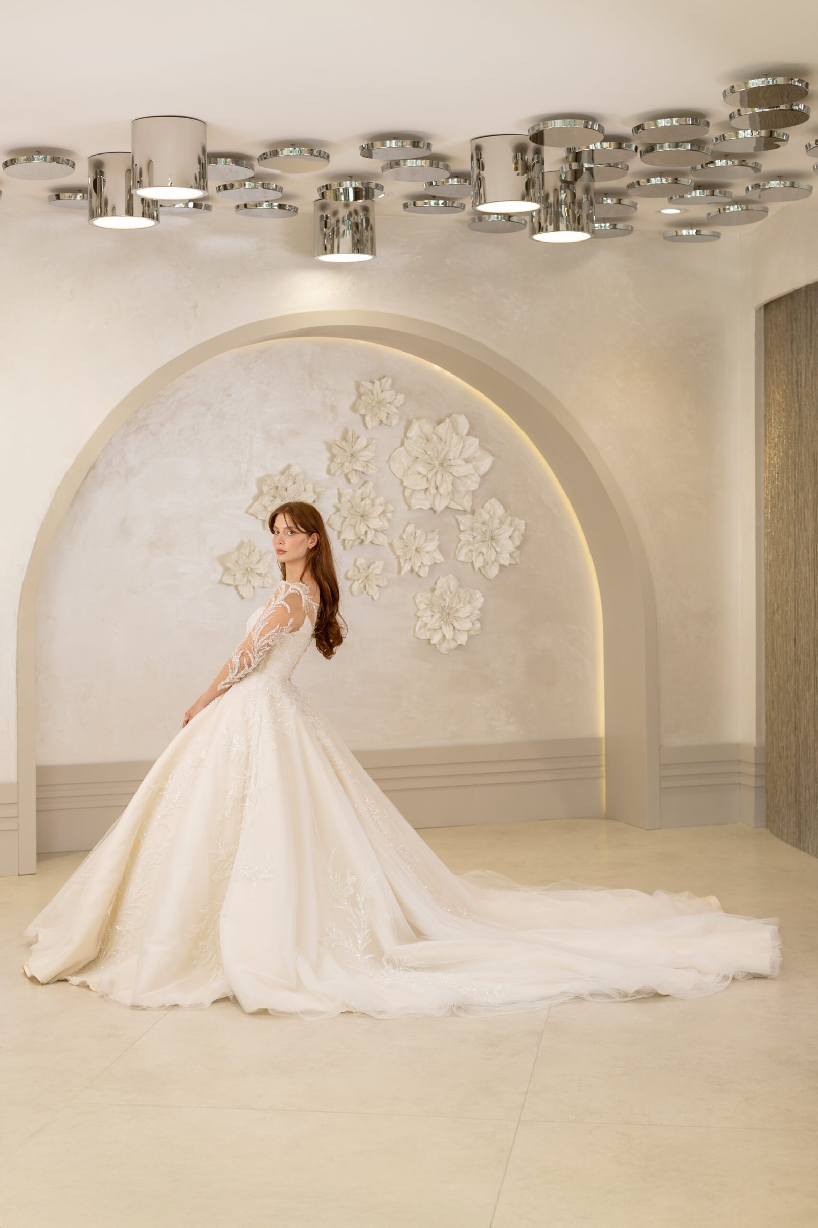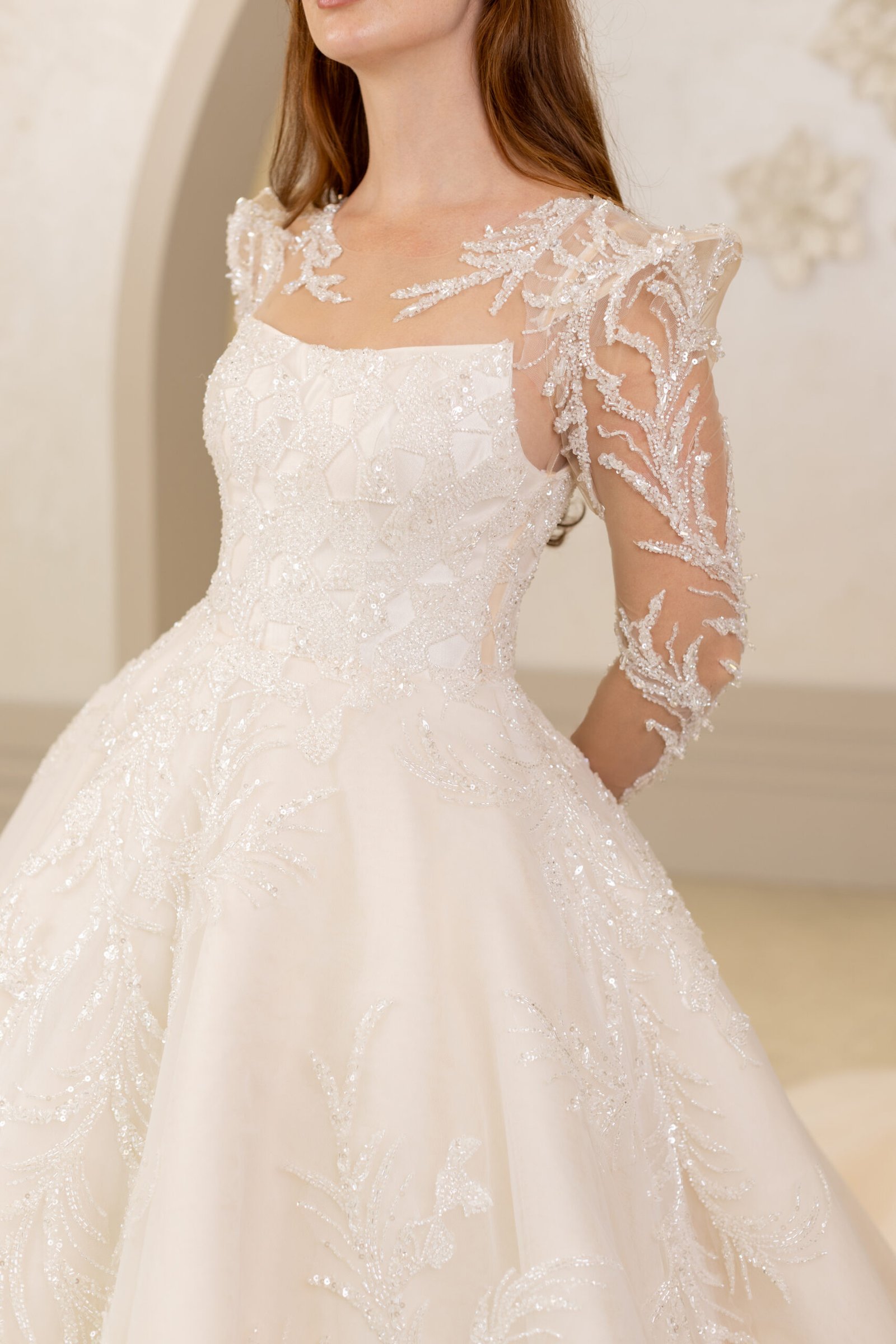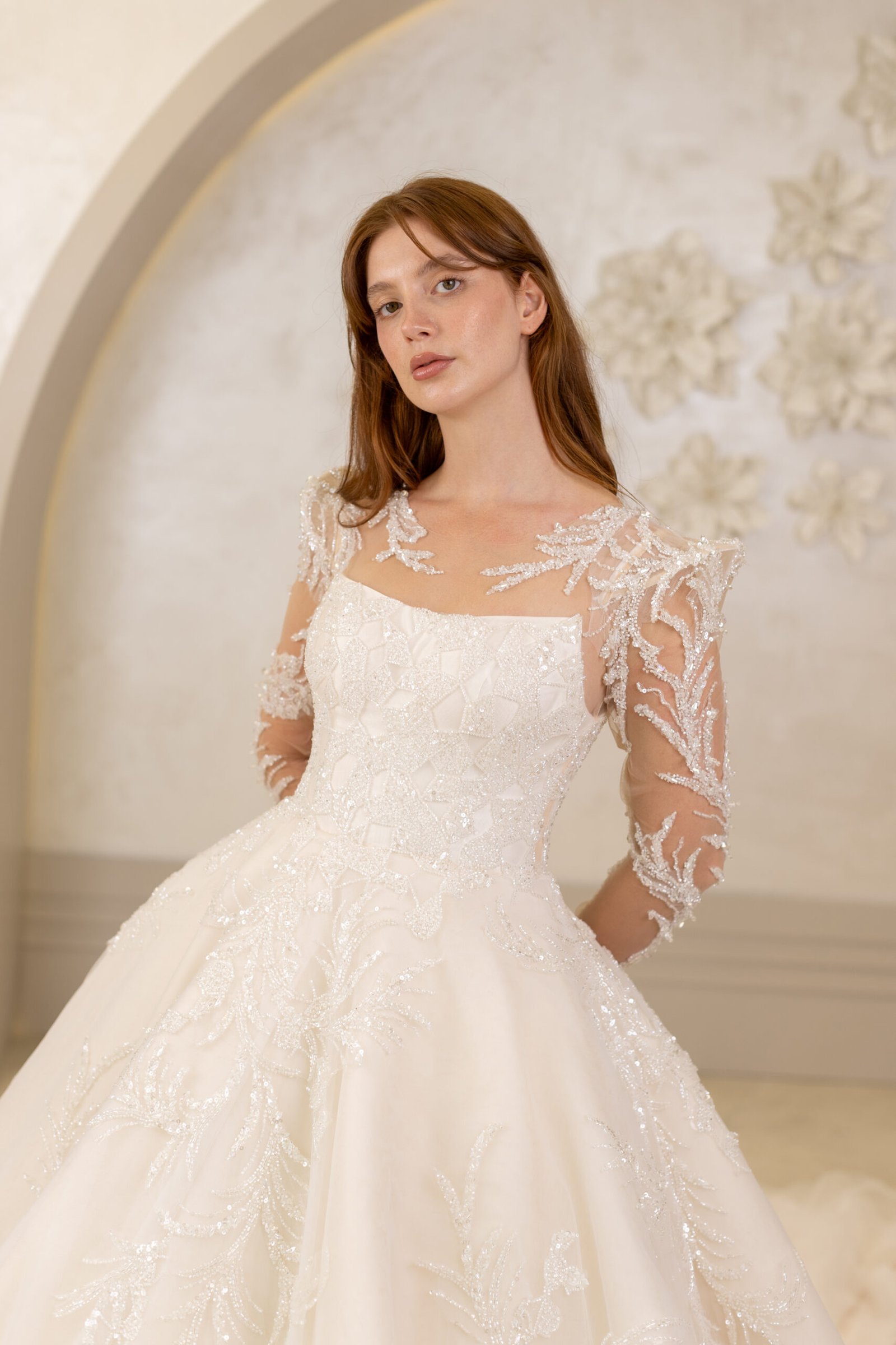 Vanessa, vatkalı omuz detayıyla güçlü bir siluet sunarken, kristal ve boncuk işlemeli danteliyle büyüleyici bir ihtişam yaratıyor. Uzun kolları ve zarif kuyruğuyla klasik bir duruşa modern bir yorum getiren bu A kesim model, göz alıcı bir sadelikle öne çıkıyor.